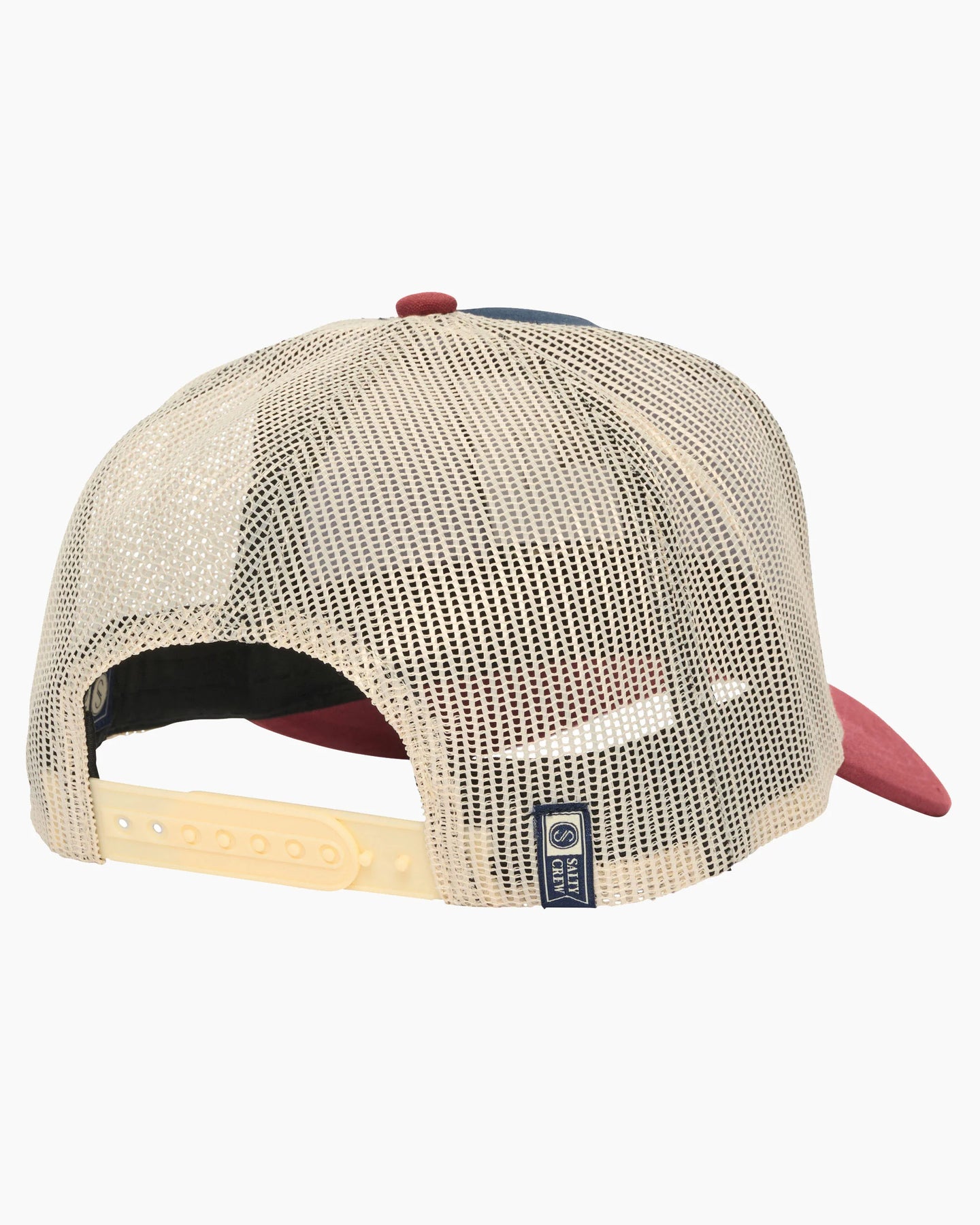 The Bill Club Trucker Cap in Navy/ Burgundy is a structured 5-panel, mid-crown height trucker cap. Made from cotton canvas and 100% polyester mesh, it features a transfer print at the front, a moisture-wicking sweatband, and a plastic snapback closure at the back.