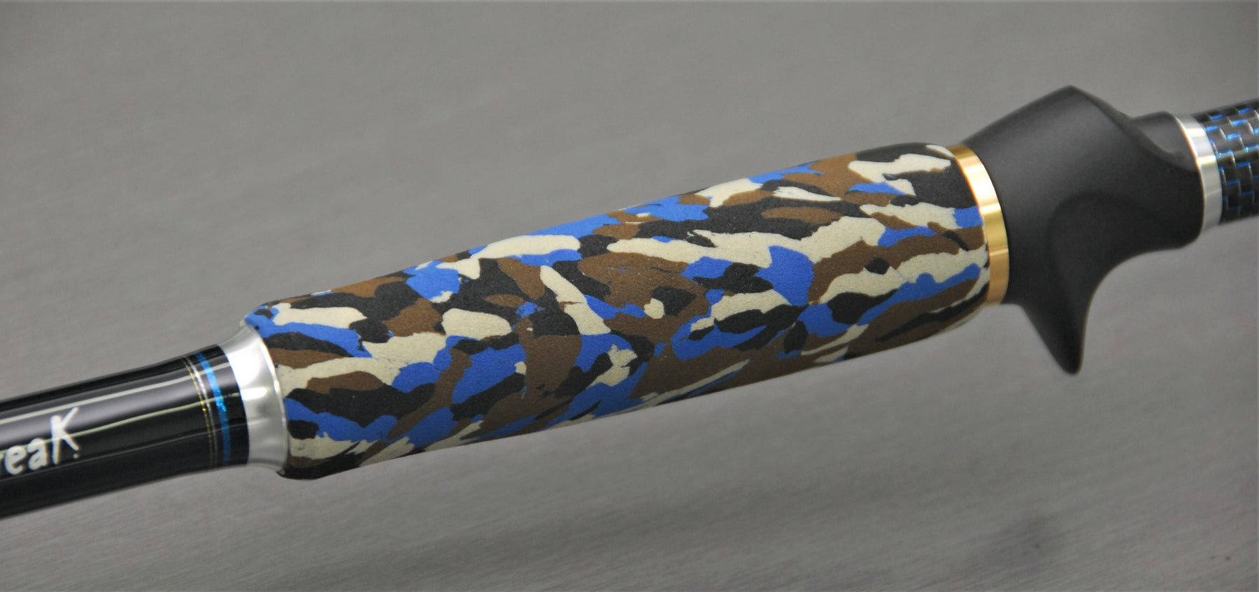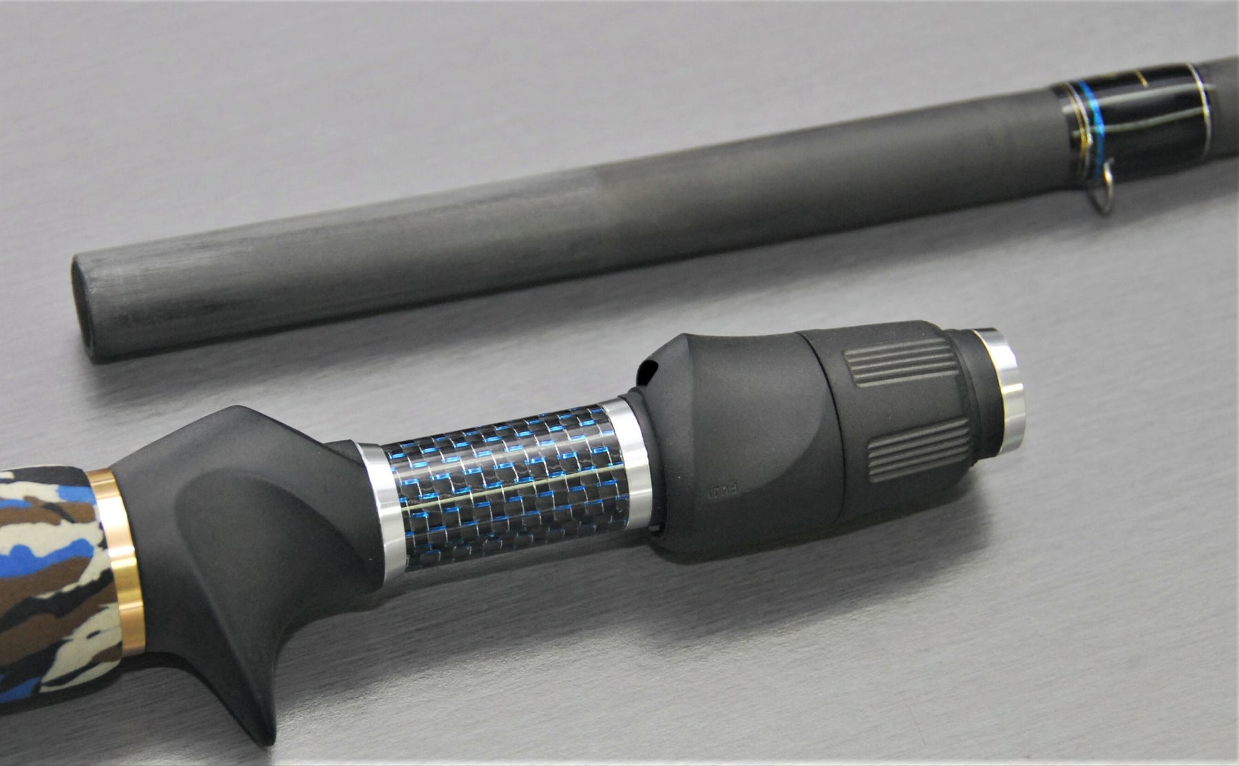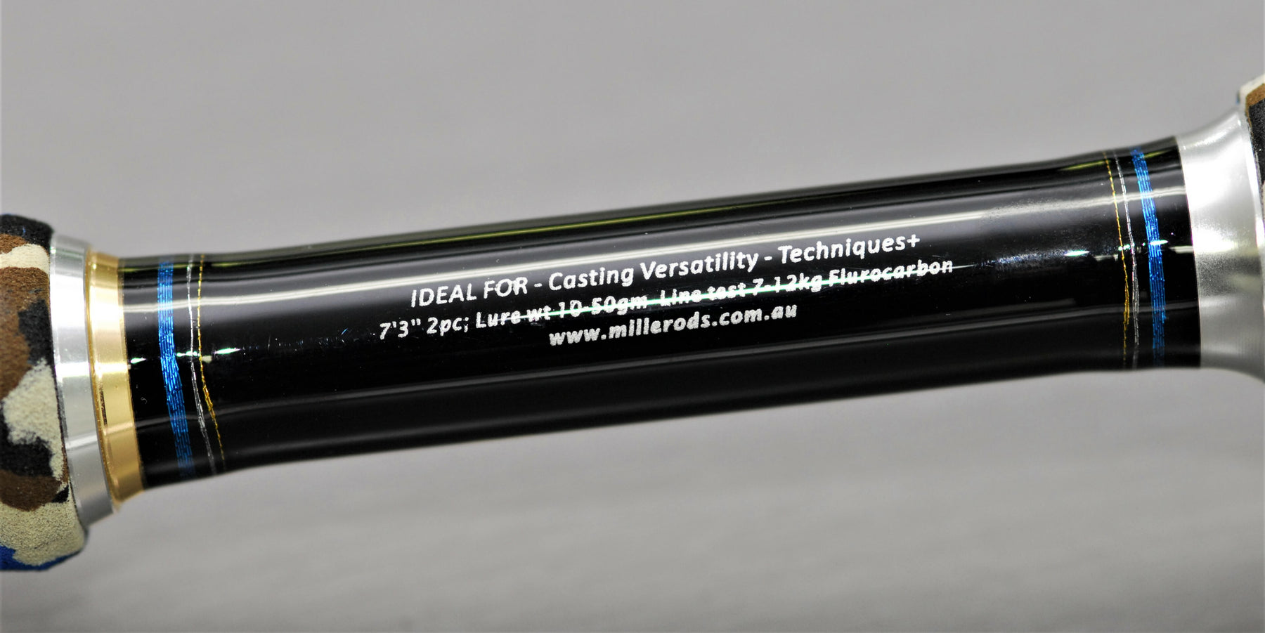 Ian’s trademark Control Freak style skeleton handle is super comfortable and also enhances the amazing sensitivity of this rod. The Fuji SKTS seat is set atop a blue carbon barrel, and custom-shaped x-firm EVA in the Millerods signature style blue Camoufish pattern, all finished with the ‘M’ logo anti-skid butt cap.