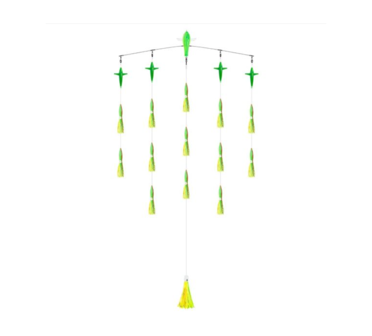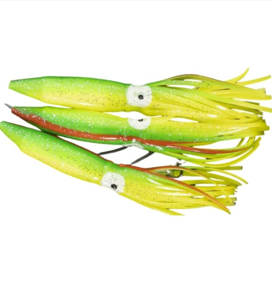 Featuring a durable 36-inch bar and rigged with high-quality 9-inch Canyon squid, this spreader bar delivers realistic swimming action and excellent visibility in a variety of offshore conditions. The balanced design ensures stable tracking at trolling speeds, while the centre stinger bait position enhances hookup opportunities when fish commit to the teaser.